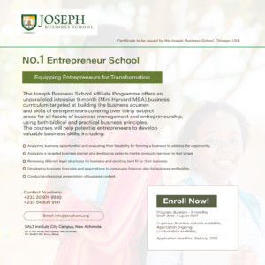 The Joseph Business School Affiliate Programme offers an unparalleled intensive 9-month (Mini Harvard MBA) business curriculum targeted at building the business acumen and skills of entrepreneurs covering over thirty subject areas for all facets of business management and entrepreneurship, using both biblical and practical business principles. The courses will help potential entrepreneurs to develop valuable business skills, including: